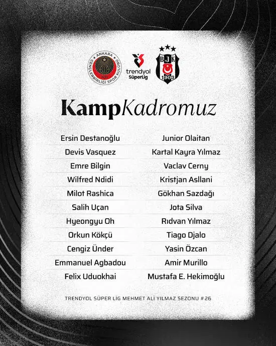 Beşiktaş’ın Trendyol Süper Lig’in 26. haftasında Gençlerbirliği ile deplasmanda oynayacağı mücadelenin kamp kadrosu açıklandı.