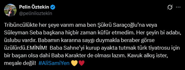 Şevket Çoruh’un tiyatroya olan katkılarına saygı duyduğunu ancak sergilediği duruşun babasının mirasıyla örtüşmediğini belirten Öztekin, açıklamalarını şu çarpıcı sözlerle noktaladı: