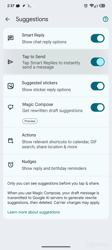9to5Google tarafından tespit edilen Google Mesajlar’ın 20260303 numaralı beta sürümü, bu can sıkıcı durumu tamamen ortadan kaldırıyor. Yeni eklenen ayar sayesinde kullanıcılar, yapay zeka önerilerinin nasıl işleneceği konusunda artık tam kontrole sahip oluyor. Yeni özelliğe uygulamanın Ayarlar > Öneriler > Göndermek için Dokun menüsü üzerinden kolayca ulaşılabiliyor.