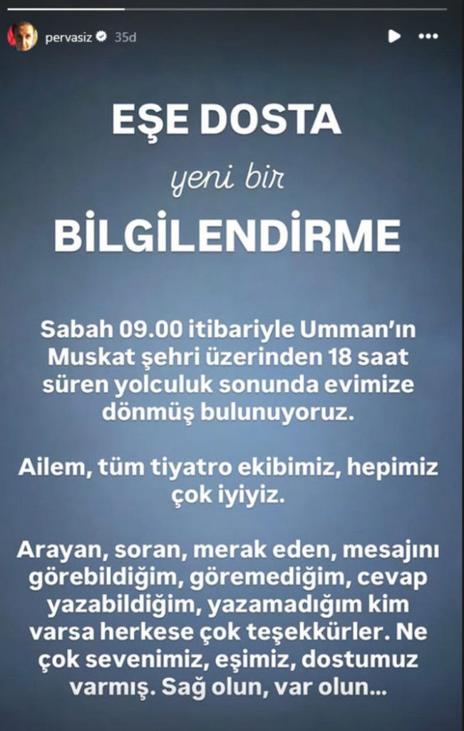 İlker Ayrık, yaptığı yeni açıklamada Türkiye’ye döndüklerini duyurdu. Ayrık, “Sabah 09.00 itibarıyla Umman’ın Maskat şehri üzerinden 18 saat süren yolculuk sonunda evimize dönmüş bulunuyoruz. Ailem, tüm tiyatro ekibimiz, hepimiz çok iyiyiz. Arayan, soran, merak eden, mesajını görebildiğim, göremediğim, cevap yazabildiğim, yazamadığım kim varsa herkese çok teşekkürler. Ne çok sevenimiz, eşimiz, dostumuz varmış. Sağ olun, var olun” dedi.